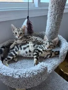 The cost of our kittens starts at $1,700 for our brown rosetted kitten. Our silver and Snow Bengal kittens are $2,000. A kitten I would keep myself to show is considerably more and would start at $3,000, because this kitten would have to fit the breed standard almost perfect.