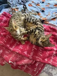 Our kittens are well socialized, not caged, born and raised in our home, have A 2 year health guarantee, have had their 2 sets of shots. Our breeding cats are all health tested for HCM yearly and are negative. They are also tested for PK Deficiency and Bengal PRA (Progressive Retinal Atrophy) because these are all things Bengal Cats are prone to getting. There is a reason why quality Bengal Cats are more costly than just any Bengal Cat.