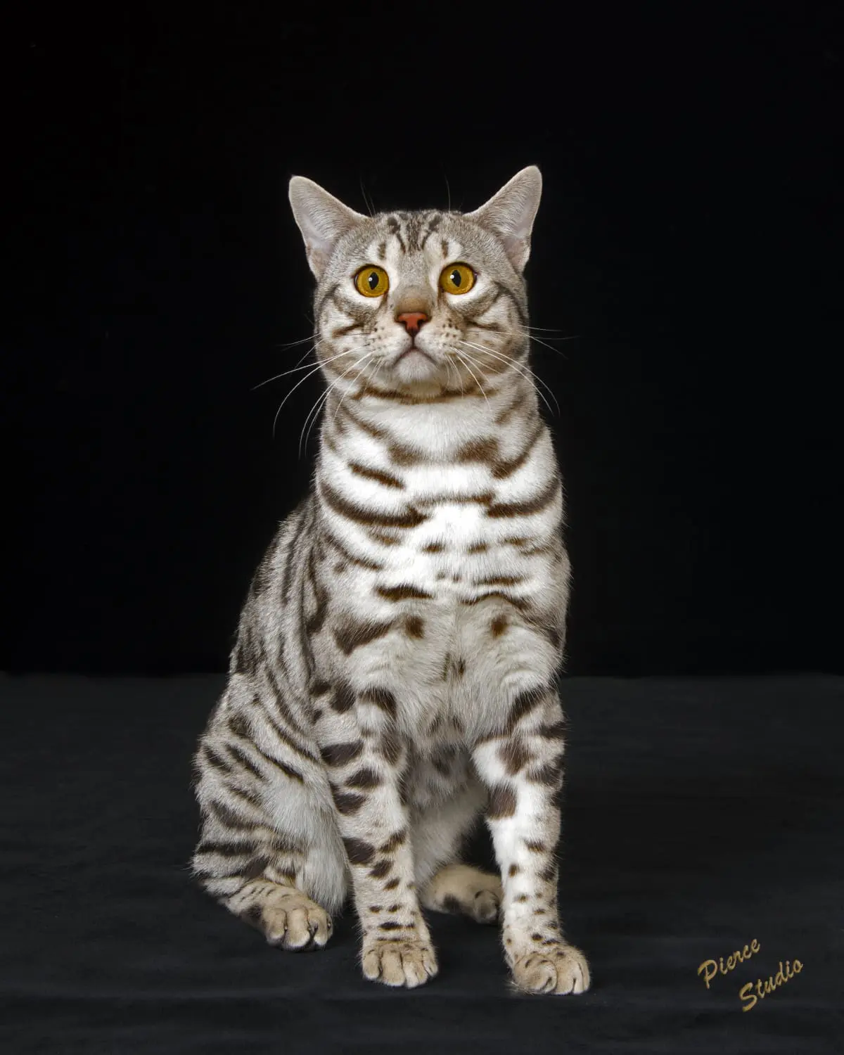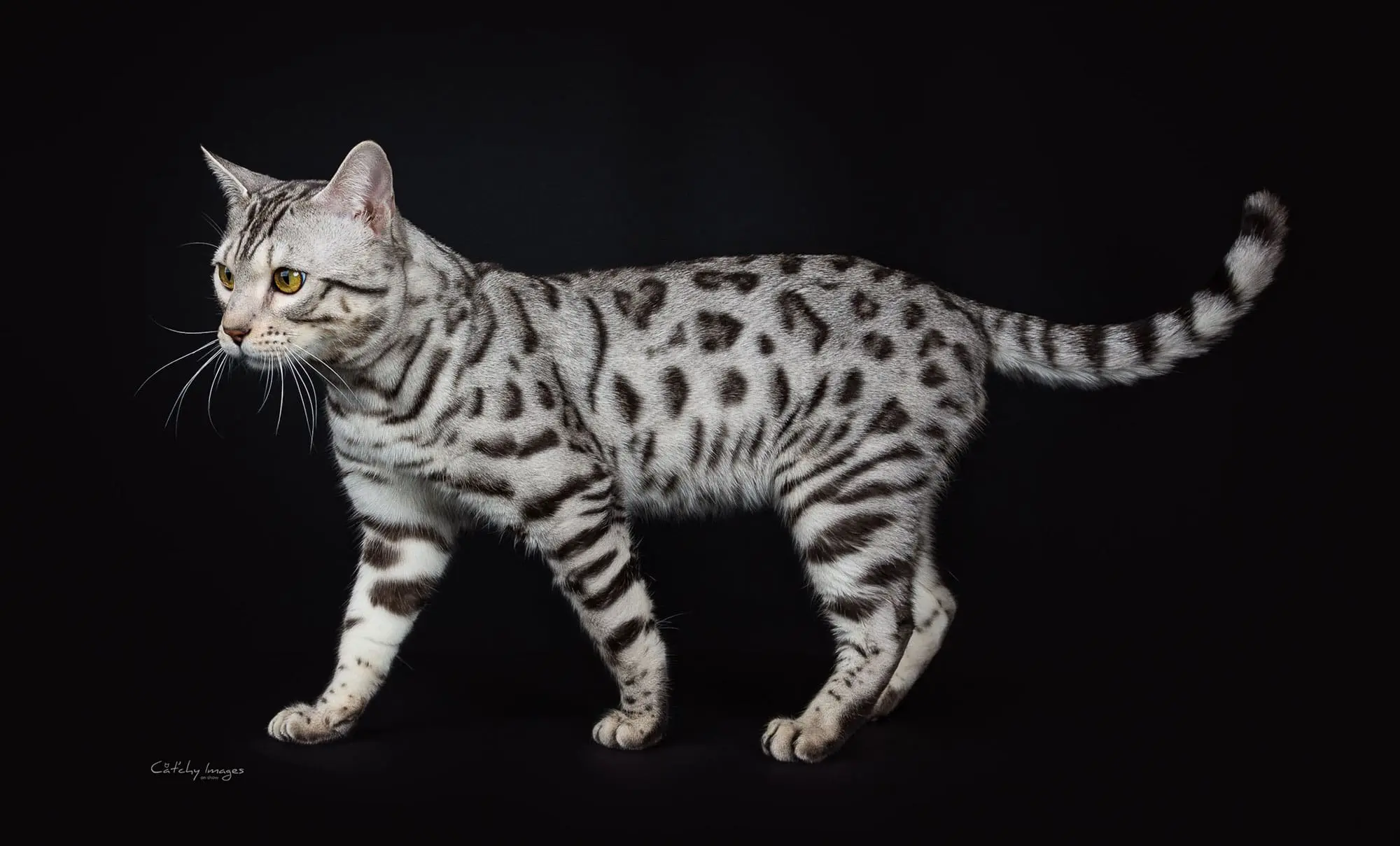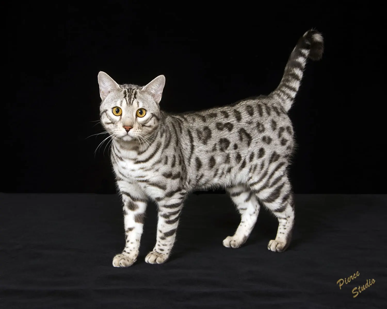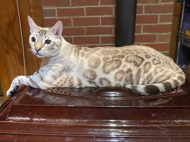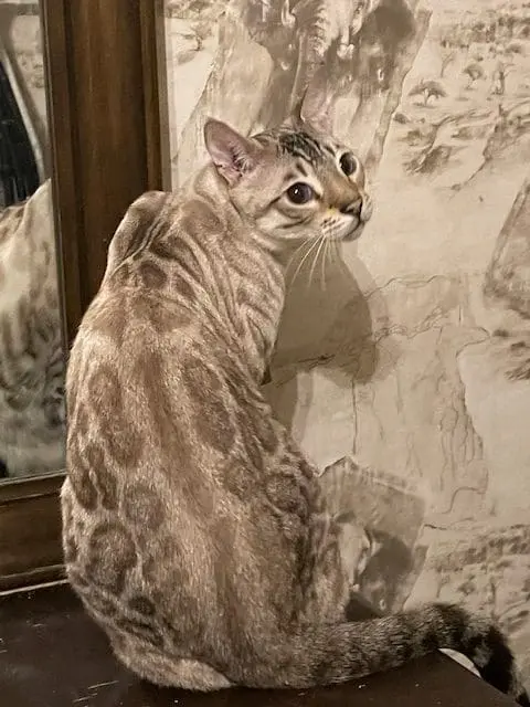 First we would like to thank you for everything you have done, and second, all we can say is WOW. We can't believe what an amazing boy Cosmo has become. At 8 months he is already 11 pounds of muscle, and stretches 30 inches from nose to tip of his tail. He really looks like the pictures of RW SGC Alter Mystical Illusion. His rosettes get more distinct each month and he still has his glitter. Cosmo is an outstanding example of the Snow Lynx-point Bengal breed.
