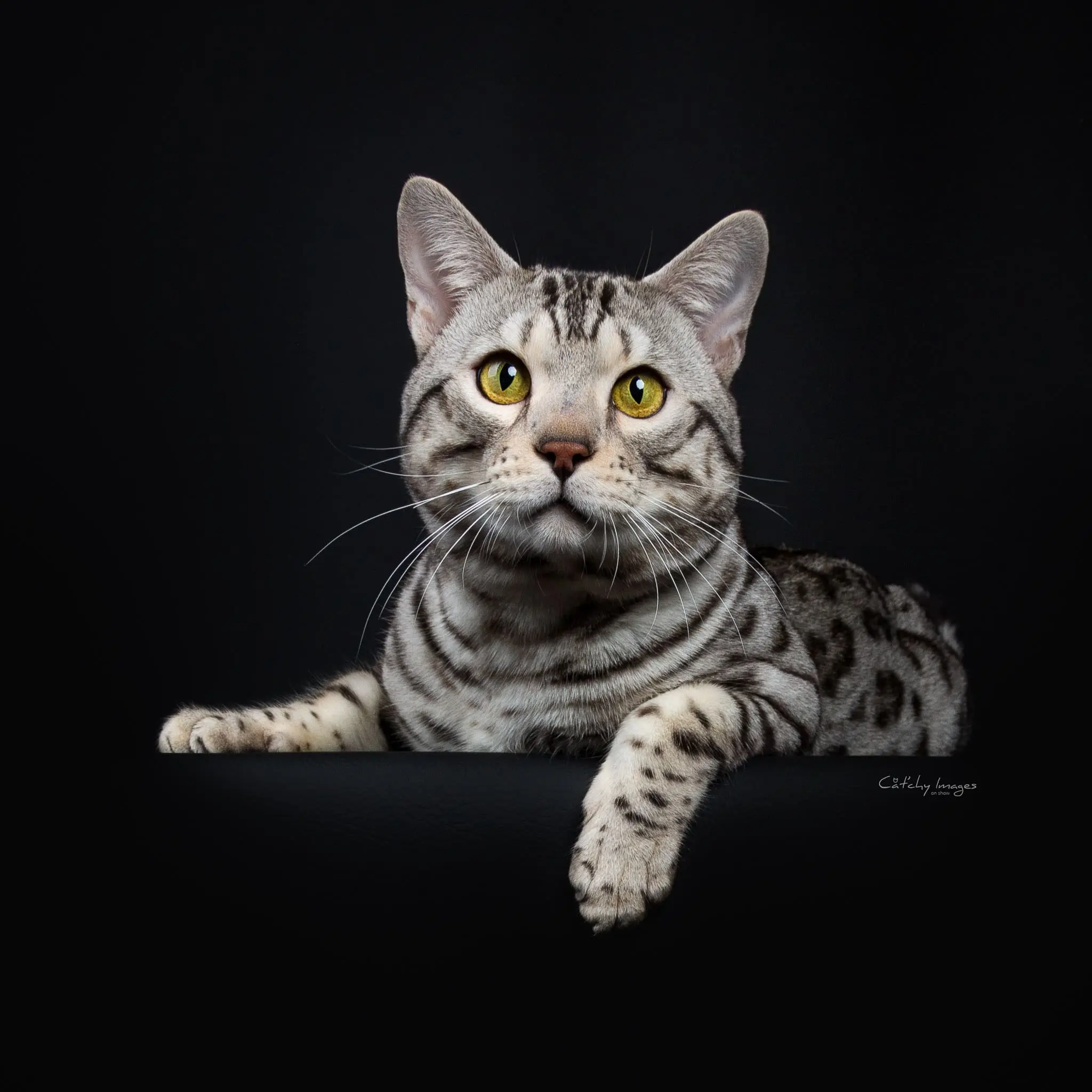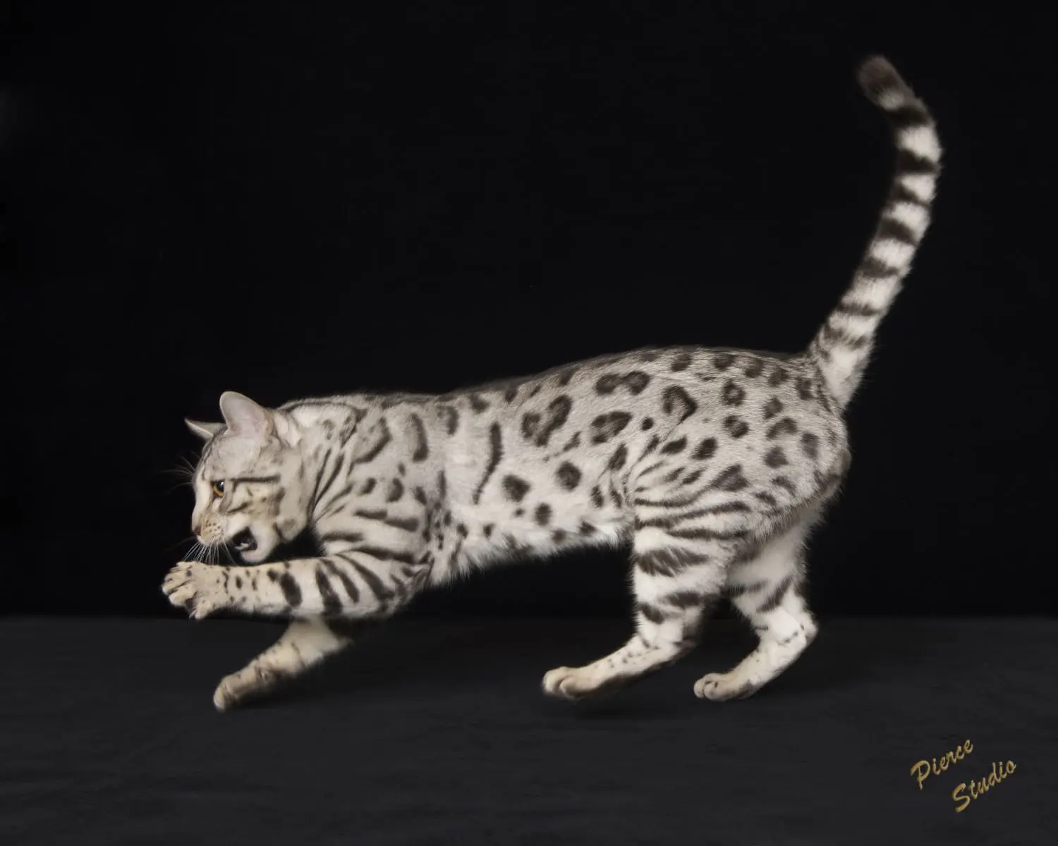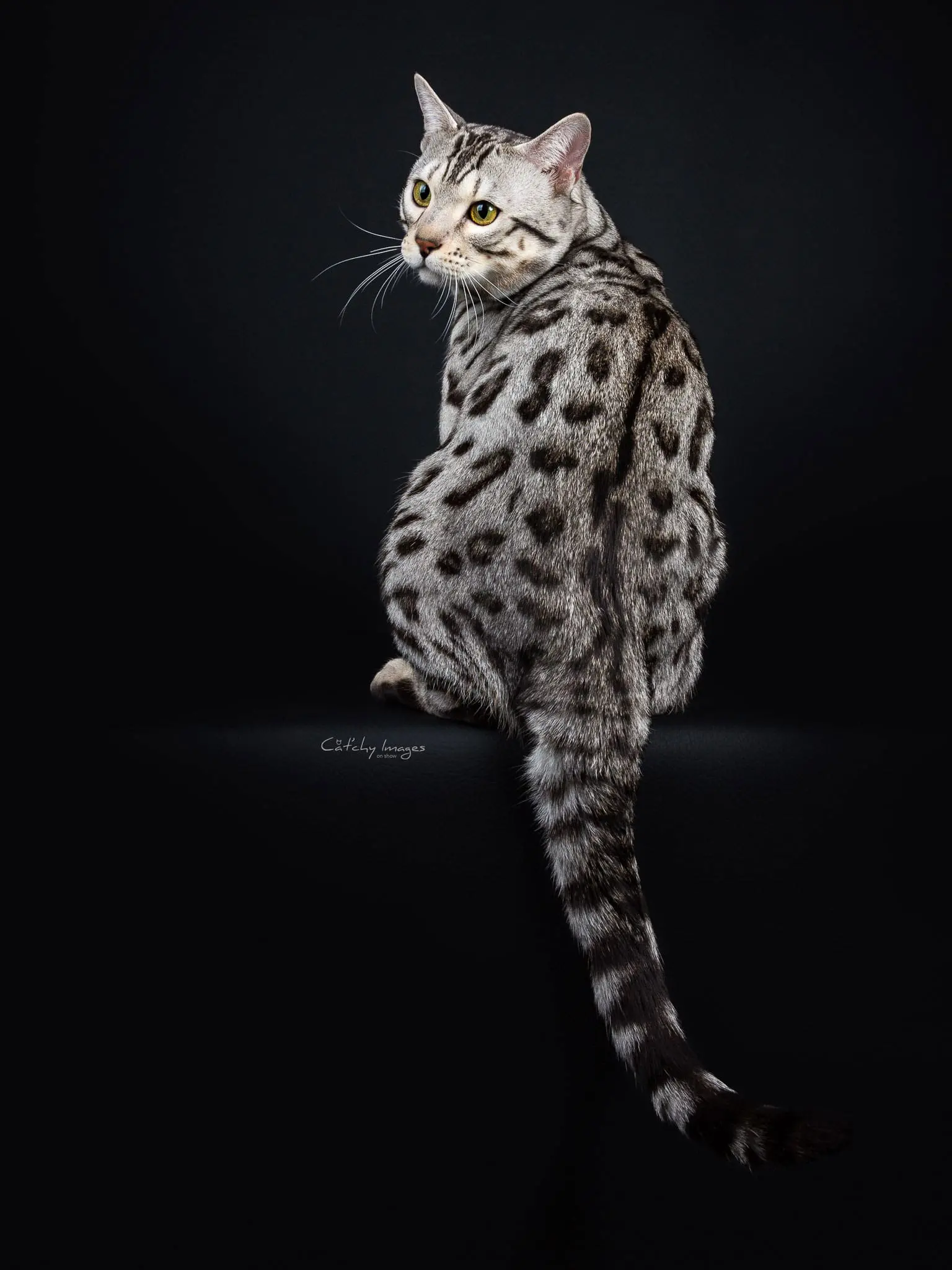 First we would like to thank you for everything you have done, and second, all we can say is WOW. We can't believe what an amazing boy Cosmo has become. At 8 months he is already 11 pounds of muscle, and stretches 30 inches from nose to tip of his tail. He really looks like the pictures of RW SGC Alter Mystical Illusion. His rosettes get more distinct each month and he still has his glitter. Cosmo is an outstanding example of the Snow Lynx-point Bengal breed.